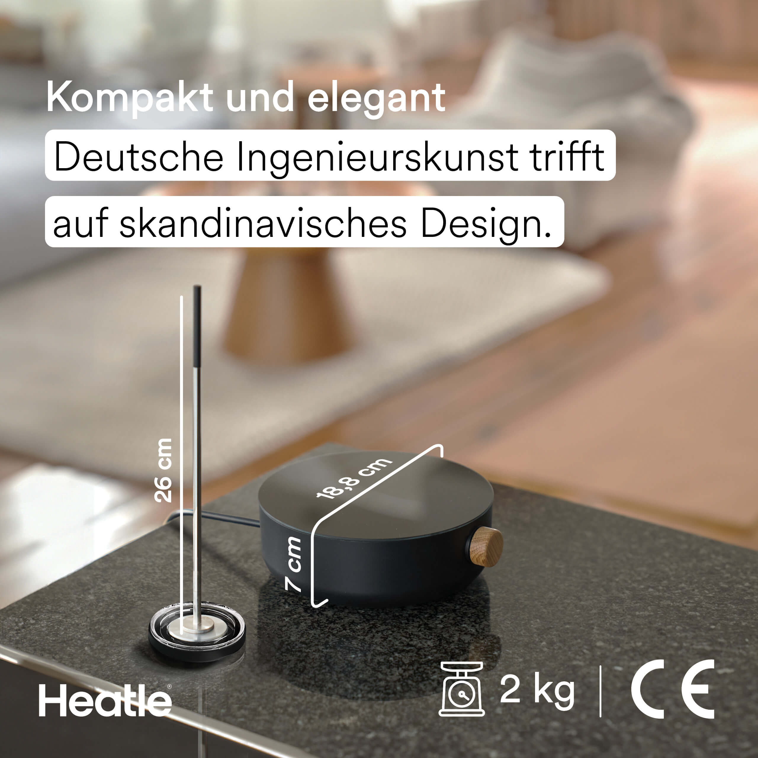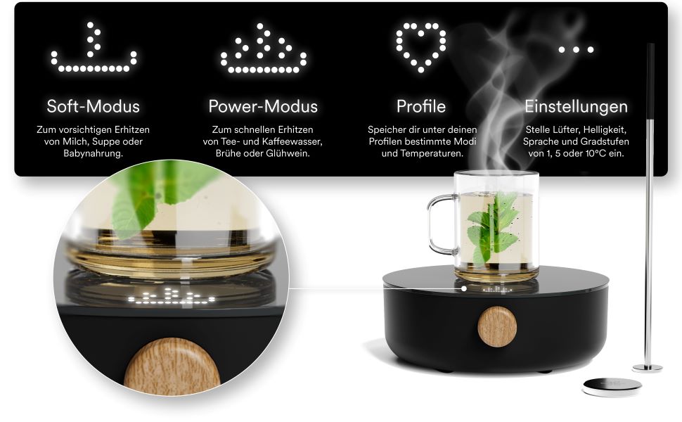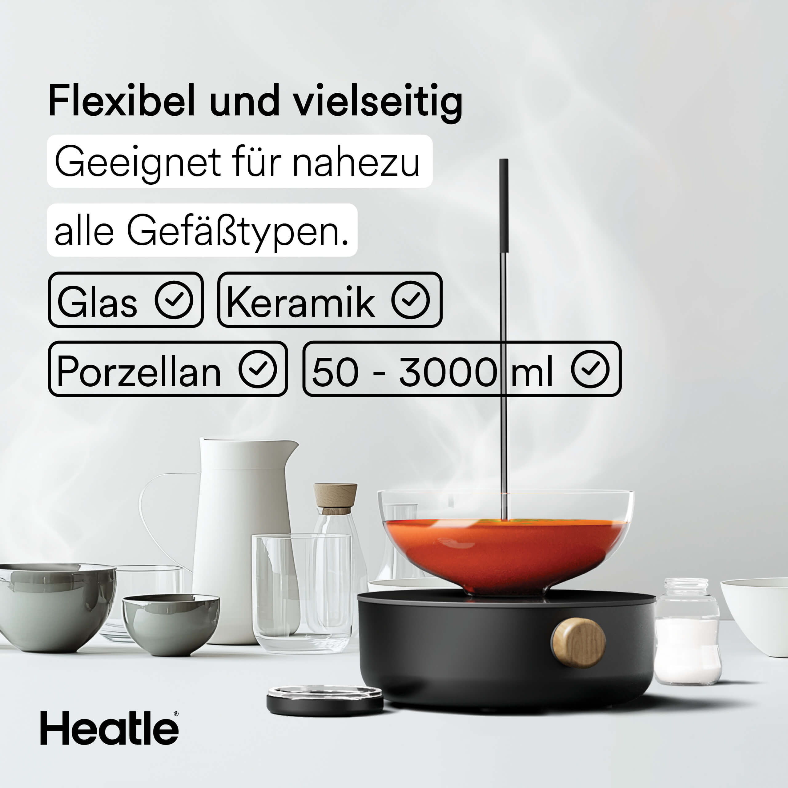 Stelle ein beliebiges Gefäß auf den Heatle und wähle einen Modus und die gewünschte Temperatur.